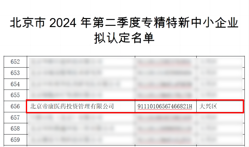 2024年8月8日,北京市經濟和信息化局發布通知公告《關于對北京市2024年度第二季度專精特新中小企業名單進行公示的通知》,奧泰康北京CDMO中心(北京帝康醫藥投資管理有限公司)被成功認定為北京市“專精特新”中小企業,這也是繼國家高新技術企業、中關村高新技術企業、北京市創新型中小企業之后獲得的又一項重要資質。