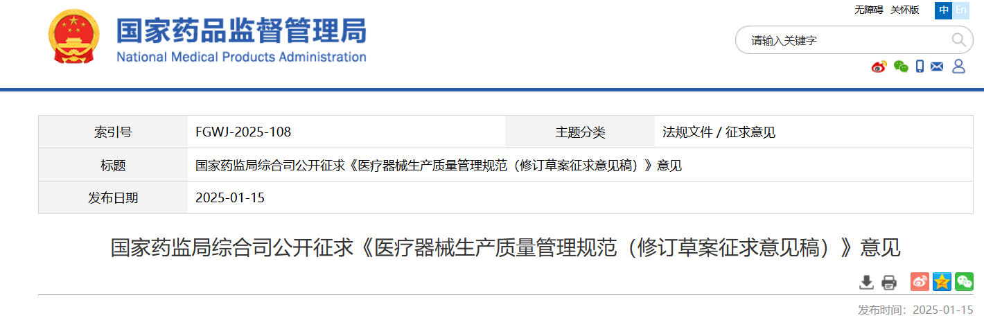 公開征求意見時間是2025年1月16日—2月14日。有關單位和個人可以將意見反饋至mdgmp@cfdi.org.cn,請在電子郵件主題注明“醫療器械生產質量管理規范—意見建議反饋”字樣。