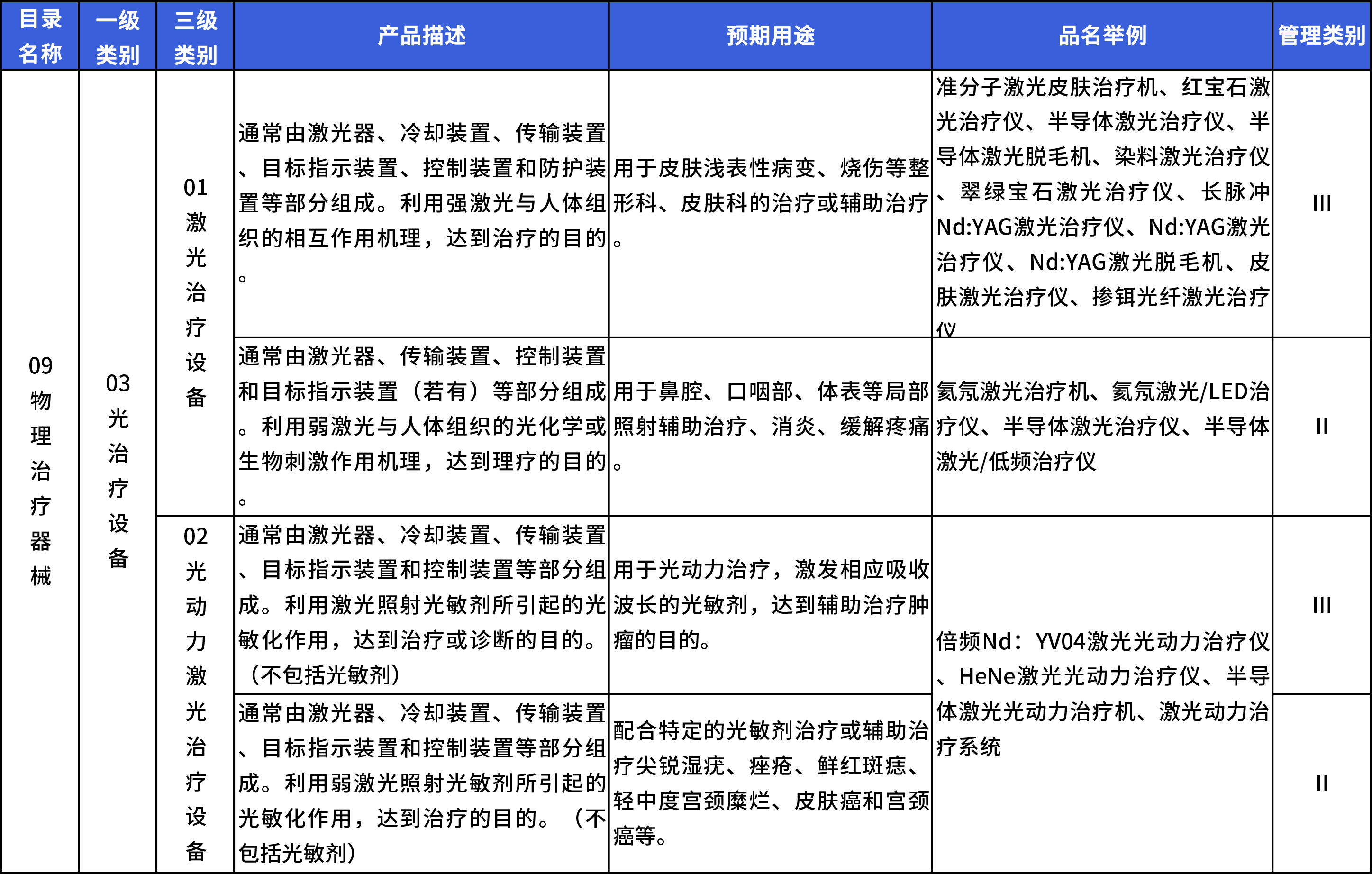 原國家食品藥品監督管理總局發布的《醫療器械分類目錄》(2017 版)主要根據醫療器械技術專業和臨床使用特點制定,其中規定醫療美容類激光產品主要屬于物理治療產品中的激光治療產品,參考分類編碼 09-03-01,管理類別為三類。