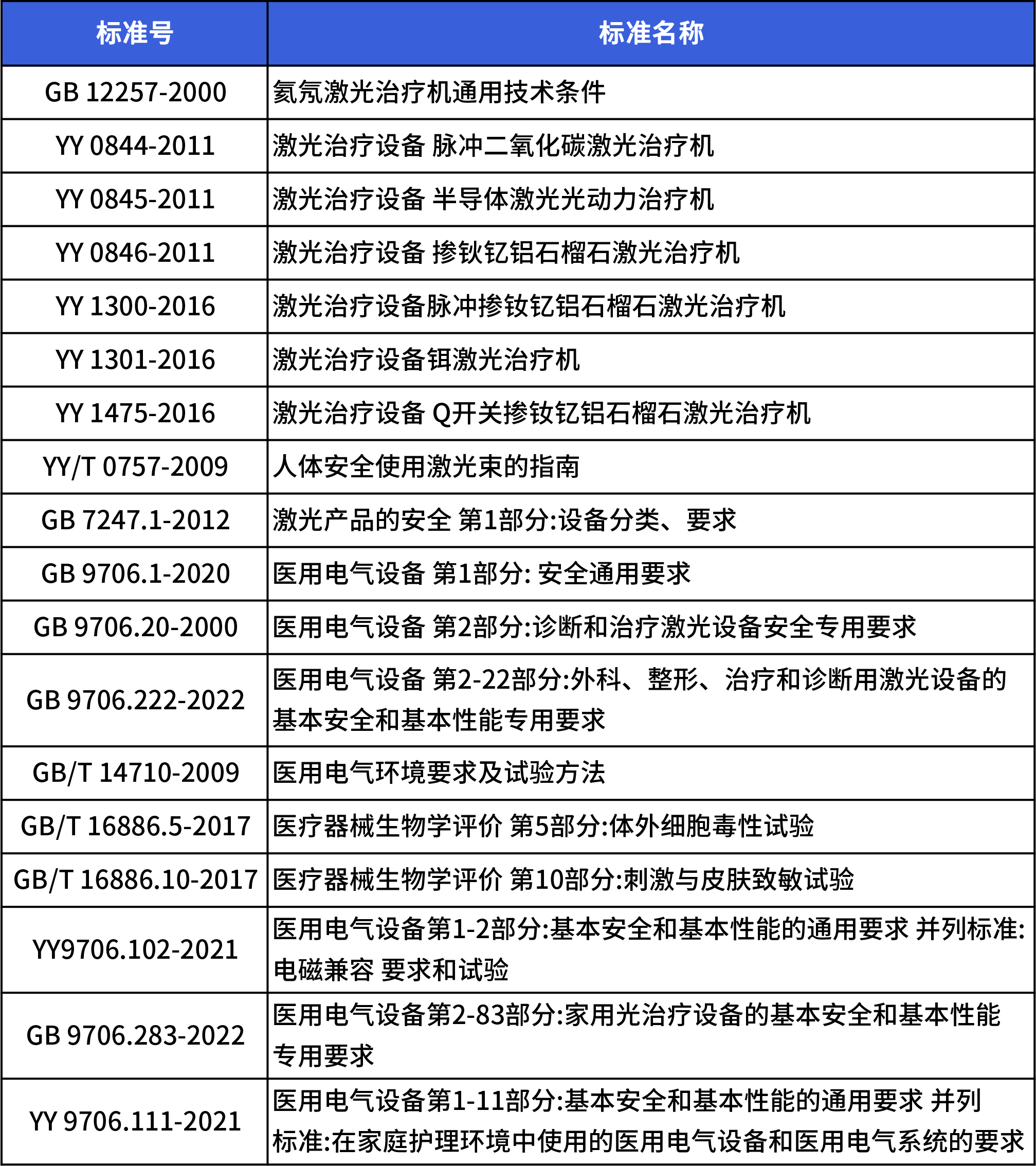 激光醫美產品的技術指標可參考指導原則和相關的標準進行制定,根據半導體材質的不同有不同的產品標準,參考標準清單大致如下: