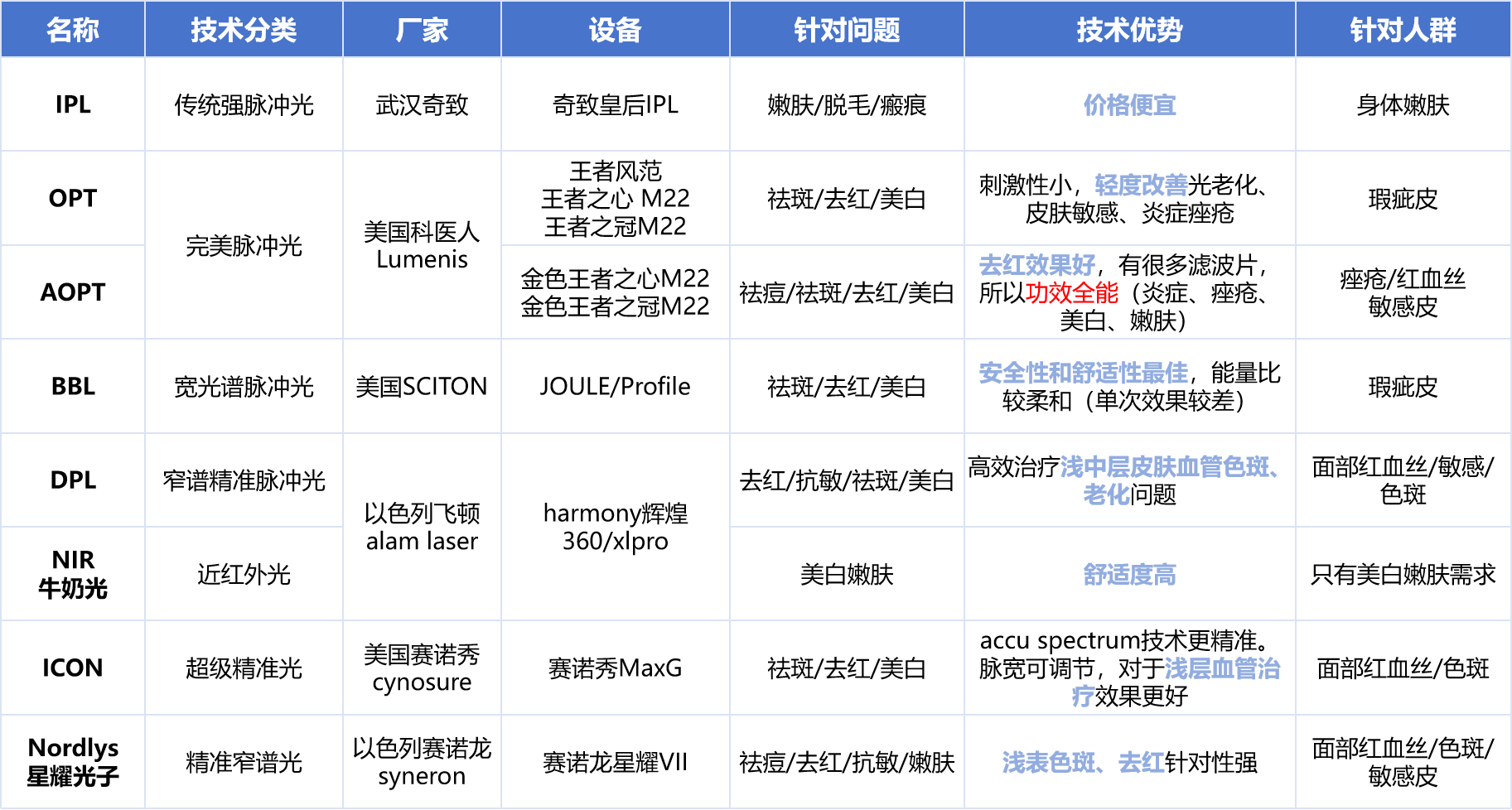 市面上常見的光子嫩膚儀器有OPT、AOPT、APT、DPL、BBL,都是在IPL基礎上發展的強脈沖光,只是各自代表儀器不相同。OPT在中國的臨床使用時間最長,有條件的醫院,已將OPT升級成了AOPT;DPL和ATP使用時間相對較長;BBL進入中國只有幾年。
