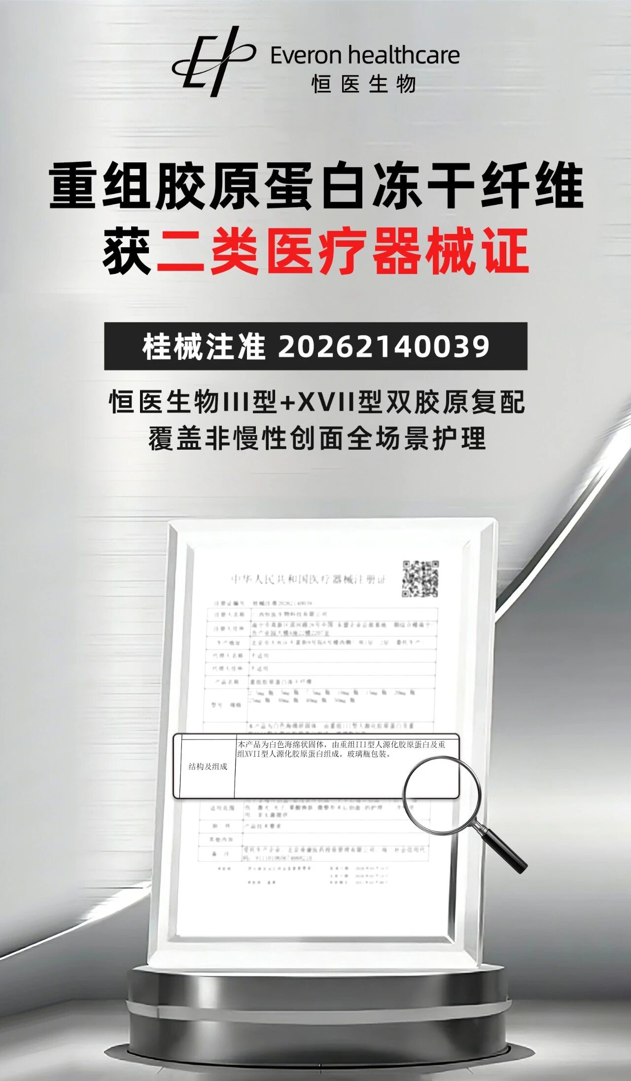 此次獲批的重組膠原蛋白凍干纖維,核心成分為重組III型及XVII型人源化膠原蛋白,與人體自身膠原蛋白高度同源,具備低免疫原性、高生物相容性的優(yōu)勢,聚焦創(chuàng)面護理核心場景,用于非慢性創(chuàng)面(如淺表性創(chuàng)面、手術后縫合創(chuàng)面、小創(chuàng)口、擦傷、激光/光子/果酸換膚/微整形術后創(chuàng)面)的護理。該產品既延續(xù)了恒醫(yī)生物在重組膠原蛋白領域的技術積淀,更在奧泰康的技術賦能下,實現(xiàn)產品性能的迭代升級,貼合臨床實際需求,也契合當前重組膠原蛋白醫(yī)用敷料千億市場的發(fā)展趨勢。